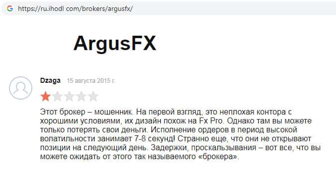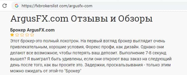 На веб-сервисе fxbrokerslist com был найден пользовательский отзыв о лохлтроне Аргус ФХ. Автору данного отзыва так же показался сайт мошенников на первый взгляд привлекательным, однако он убедился в том, что контора ArgusFX делает все возможное, чтобы клиент потерял свой депозит и в итоге остался ни с чем, возможно еще и с долгами.
