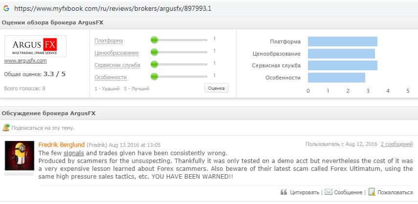На иностранном сайте специализирующемся на проверке скам-брокерских организаций на мошенничество myfxbook com был обнаружен отзыв о жульнической конторе Аргус ФХ. Выяснилось, что связавшись с данной компанией можно очень сильно пострадать потеряв все свои денежные средства и драгоценное время.