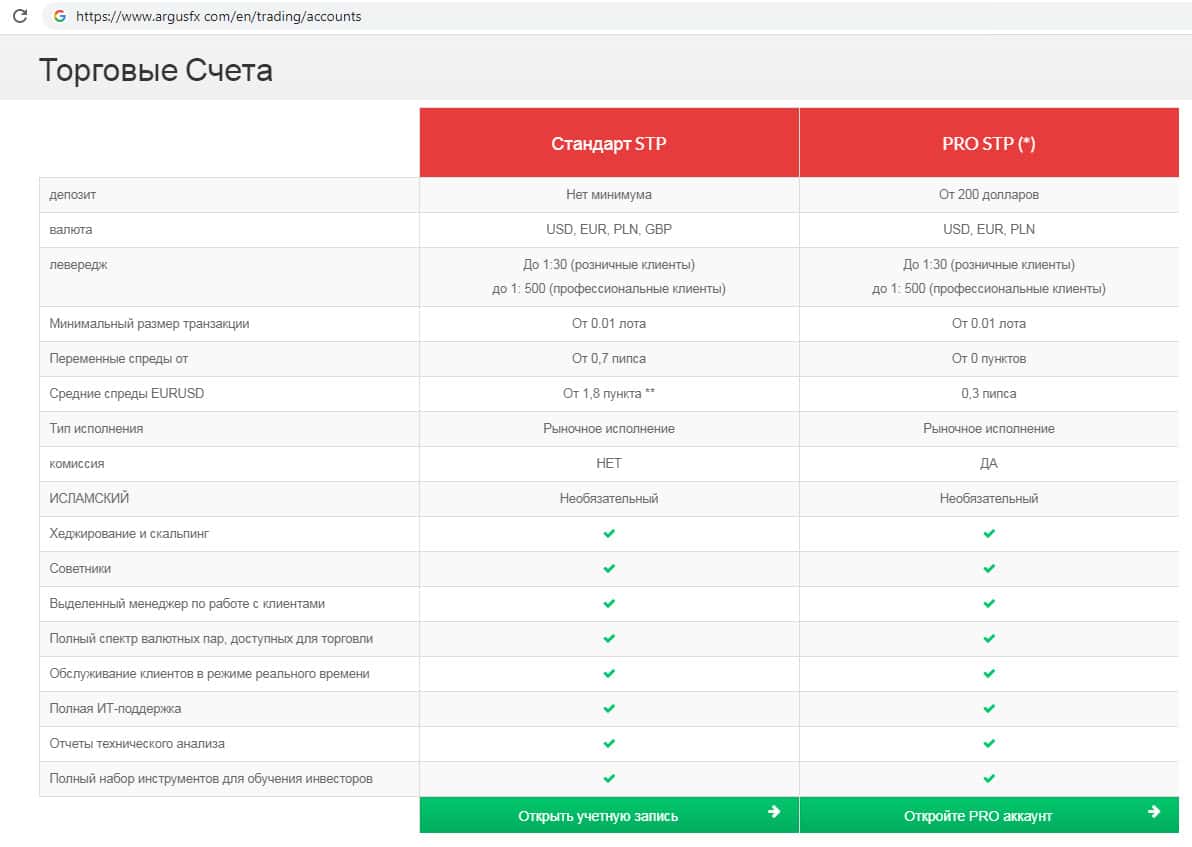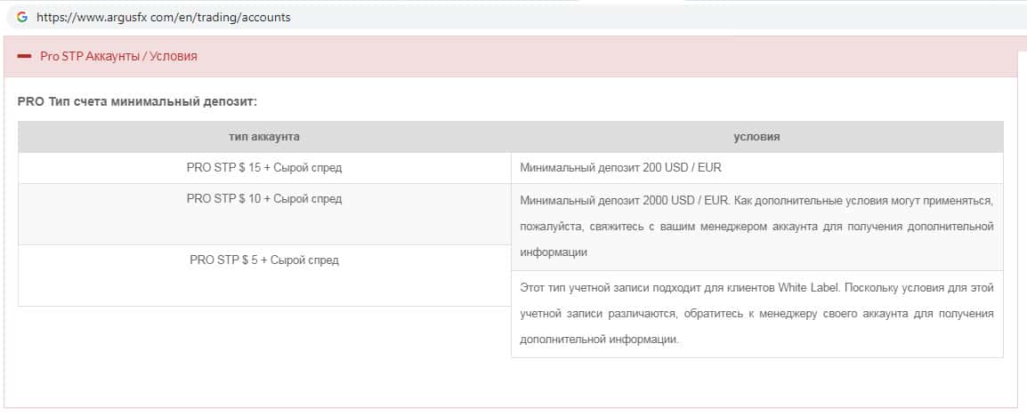 - Типы торговых счетов на сайте мошенников АргусФХ