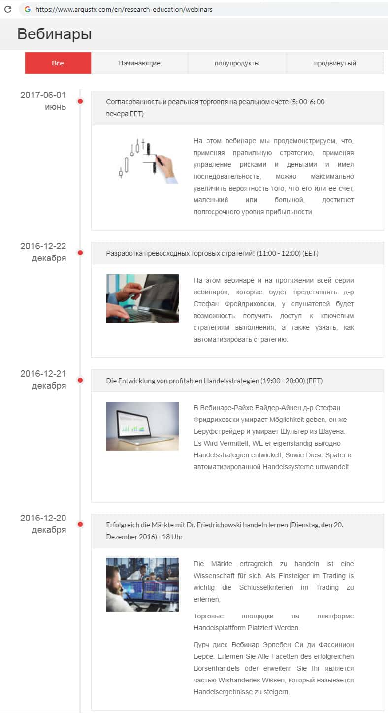 Жулики ArgusFX врут о том, что предоставляют обучение трейдингу в виде вебинаров для того, чтобы подзаработать на неопытных трейдерах. Обучиться на их фейковом сайте можно лишь только тому, что нельзя доверять непроверенным брокерским конторам и вкладывать свои деньги в дело, которое не принесет никакой прибыли.
