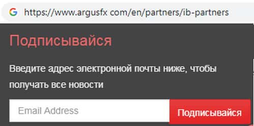 Мошенническая организация Аргус ФХ предлагает подписаться на новости их сайта, для чего пользователю необходимо указать адрес электронной почты. Указав свой адрес электронной почты приготовьтесь к тому, что просто так аферисты ArgusFX от Вас не отстанут, навязчиво рассылая предложение зарегистрироваться на их сайте.