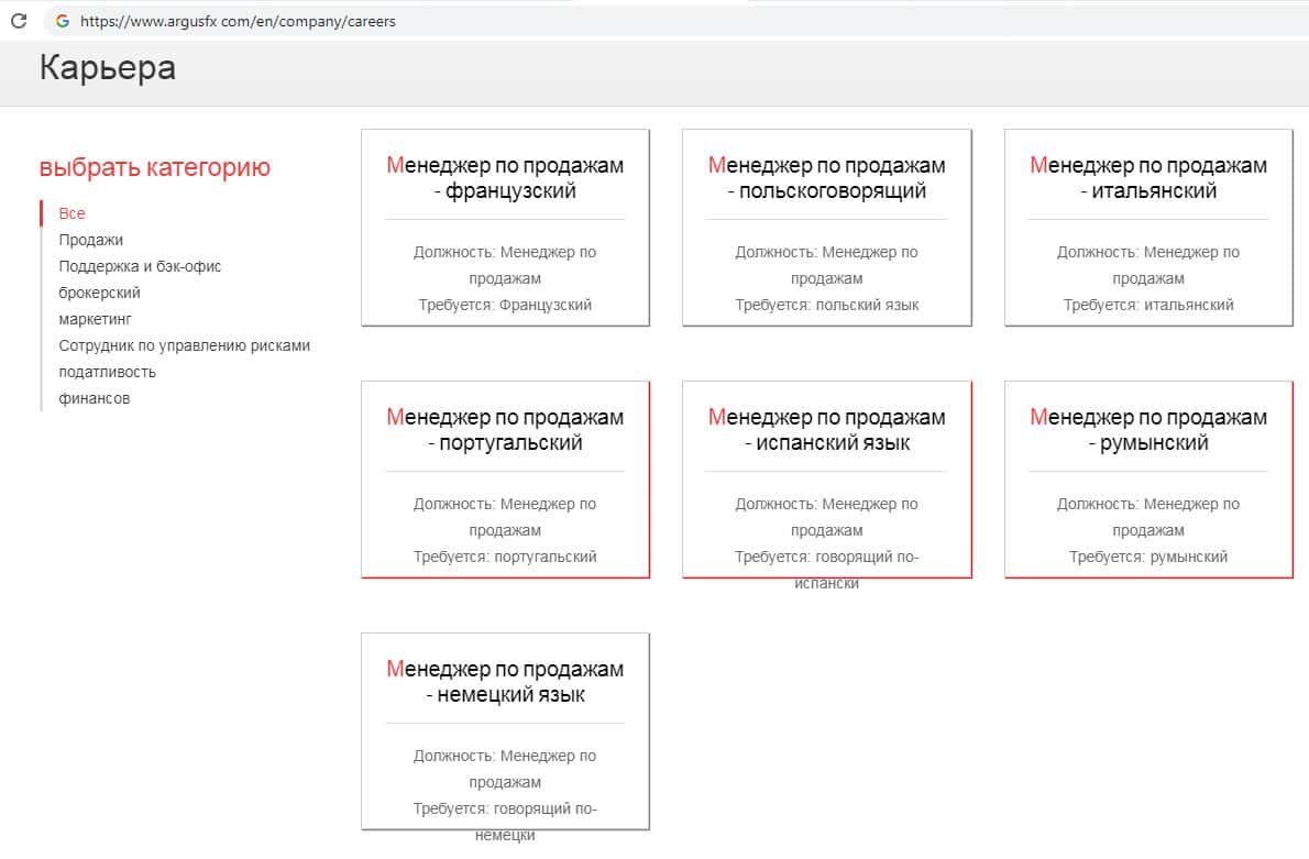 Мошенники ArgusFX вовлекают людей в свою шарагу под предлогом того, что в их организацию требуются сотрудники, в основном это менеджеры по продажам. Отправлять им свое резюме не имеет смысла, так как это всего лишь очередная мошенническая уловка для заманивания в свою брокерскую контору и не боле того.