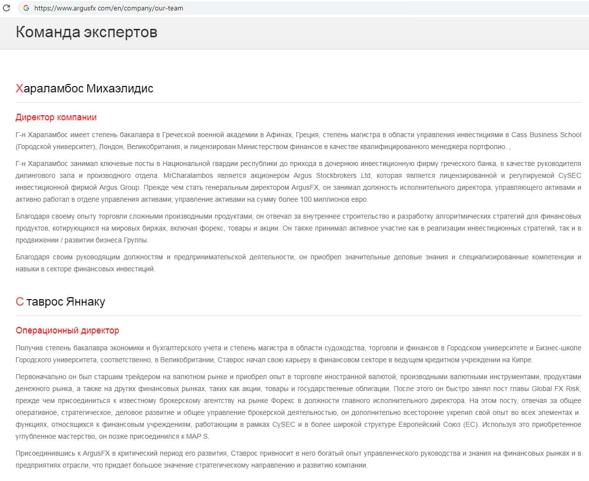 На сайте мошеннической организации Аргус ФХ обнаружена информация о руководстве компании. Фотографий на сайте к сожалению нет, но имеется биография якобы управляющих конторой - это биография директора компании, а так же операционного директора. На достоверность данную информацию проверить невозможно.