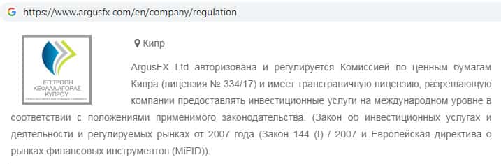 Жульническая организация Аргус ФХ имеет оффшорное место регистрации а именно зарегистрирована на острове Кипр, что является показателем того, что компания не подходит для граждан РФ. В случае утраты Вами денежных средств Вы ничего не докажете и не сможете вернуть свои деньги.