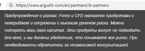 - Предупреждение о рисках потери вложенных денежных средств на сайте жуликов АргусФХ