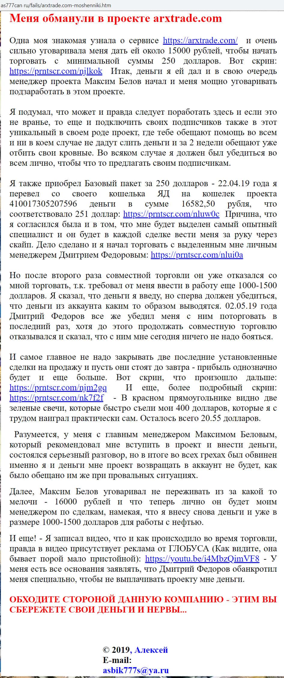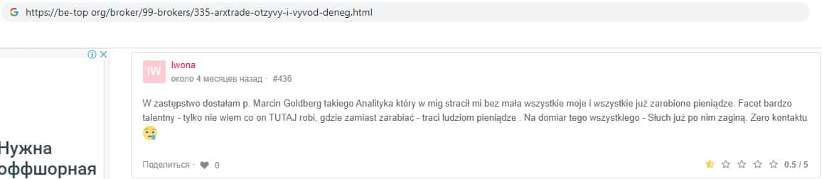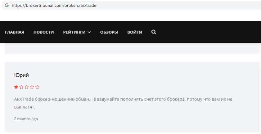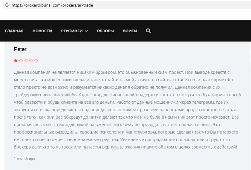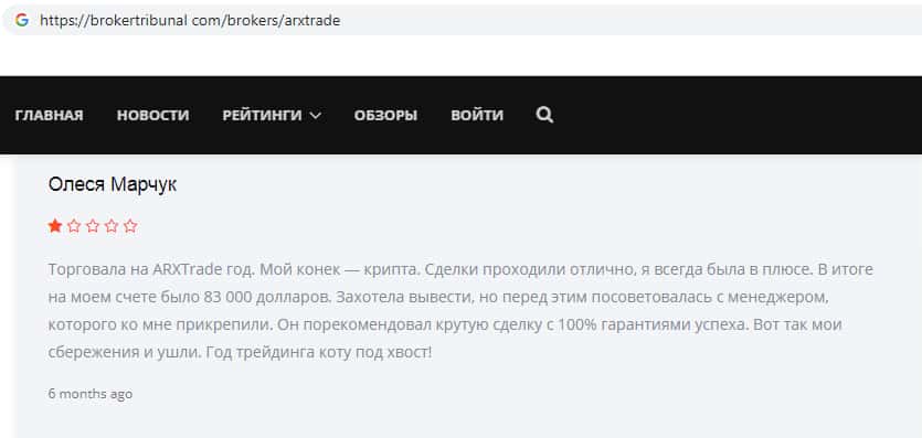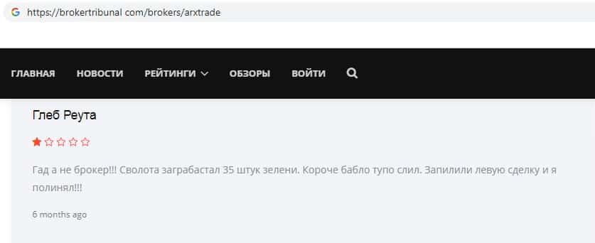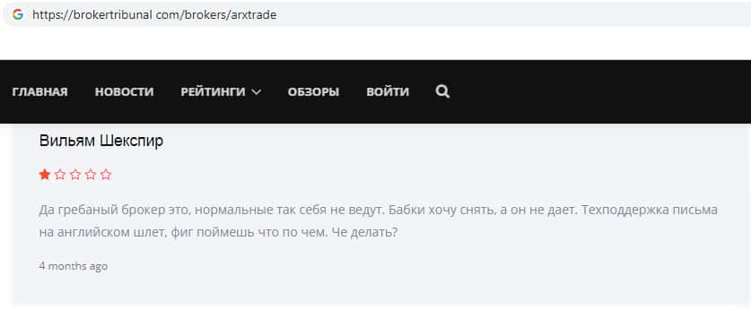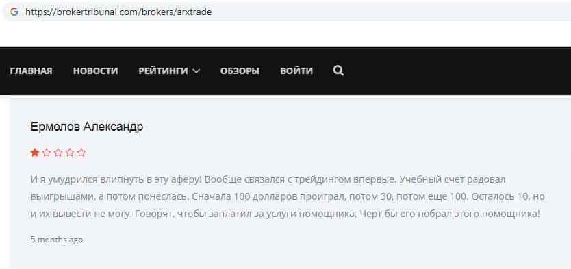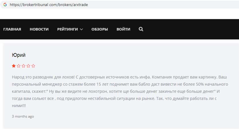 Вот ещё один яркий пример того, как на просторах всемирной паутины лохотрон ARXTrade успел засветится. Там так же информация о том, что эта фирма мошенники и занимаются разводом своих клиентов, как втираются в доверие наивным пользователям и обещают им золотые горы, но как только клиент попал в их лапы, то сразу тянут все деньги с него.