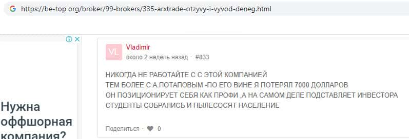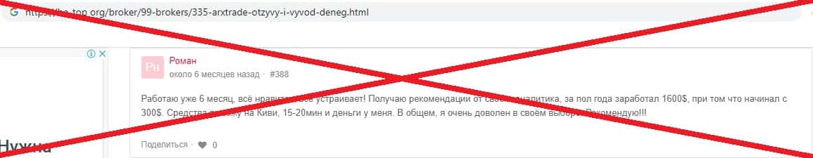 Еще одно упоминание о не правдивых отзывах пользователей лохотрона АРХ Трейд