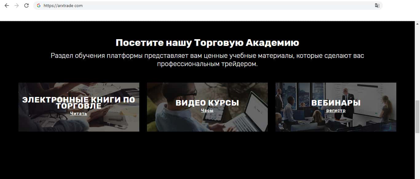 В следующем пункте мошенническая контора ARXTrade предлагает пользователям "торговую академию". Там аферисты промывают мозги трейдерам, что бы окончательно навешать лапши на уши и ввести в заблуждение клиентов. Компания предлагает электронные книги и видео курсы, где якобы будут обучать торговле и давать советы.
