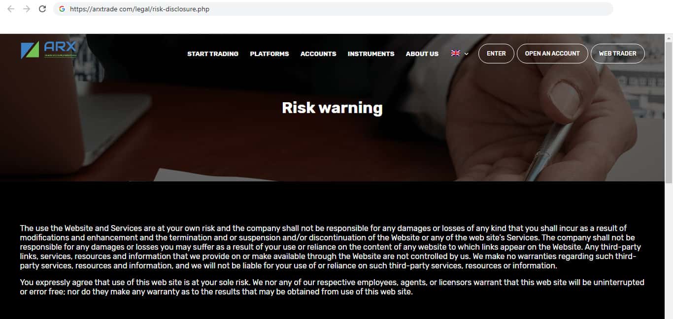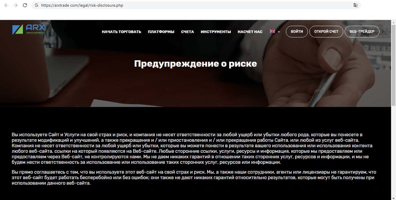 В своём предупреждение о рисках компания указывает то, что ответственности за все убытки клиентов несёт сам клиент. Так же лохотрон ARXTrade снимает с себя ответственность за то, что сотрудники компании заставляют трейдеров совершать неверные действия, которые приводят к убытку, и за это компания тоже не несёт ответственности.