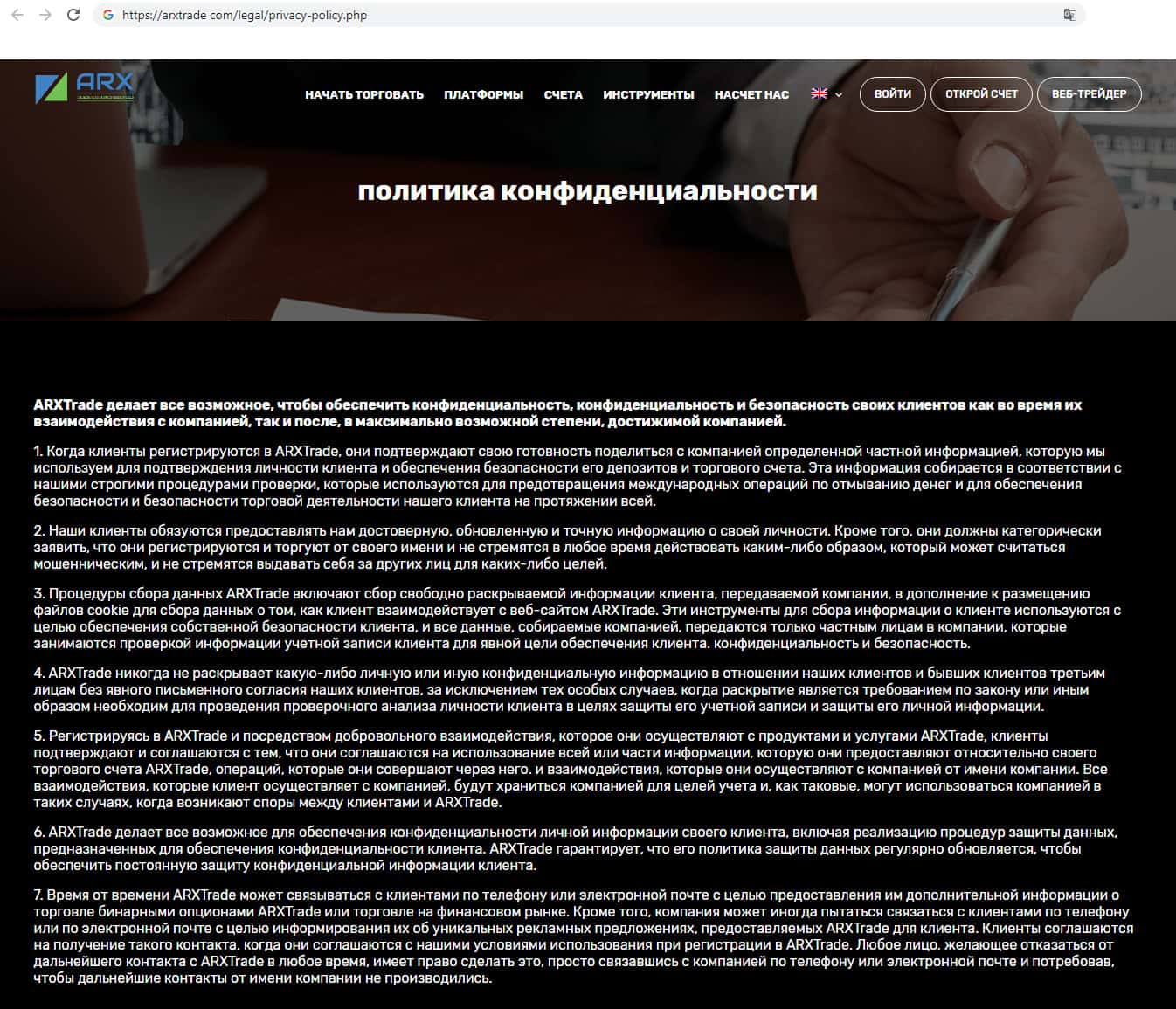 Перевод политики конфиденциальности мошеннической организации ARXTrade.