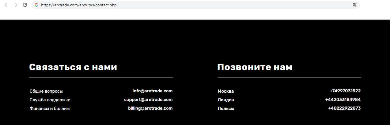 Кидалы ARXTrade указали свои контактные данные. Указаны адреса электронной почты, и номера телефонов. Во можете обратится к сотрудникам компании и задать свои вопросы, но общение с клиентами будет поддерживаться до тех пор, пока клиент будет инвестировать, но как только перестанет, или решит вывести средства, то связь прекратится. Контакты: