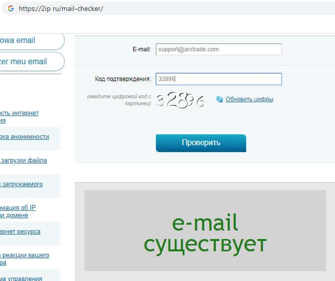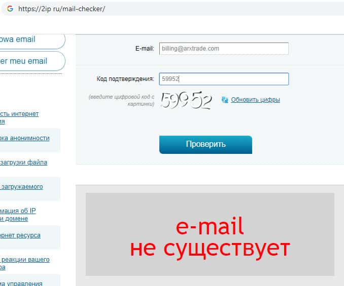 Мы проверили существование почтового адреса, и оказалось, что адрес указанный для общих вопросов не активен, другими словами его просто не существует, жулики ARXTrade указали несуществующий адрес что бы клиенты не могли связаться, а указан он для того что бы бросить пыль в глаза трейдерам, создать иллюзию надёжности сайта.