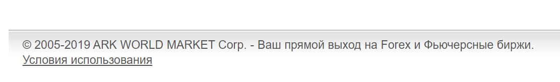 Юридическим лицом, действующим от имени сайта Арк Форекс, является компания ARK WORLD MARKET Corp. Это указано внизу главной страницы сайта.