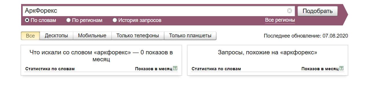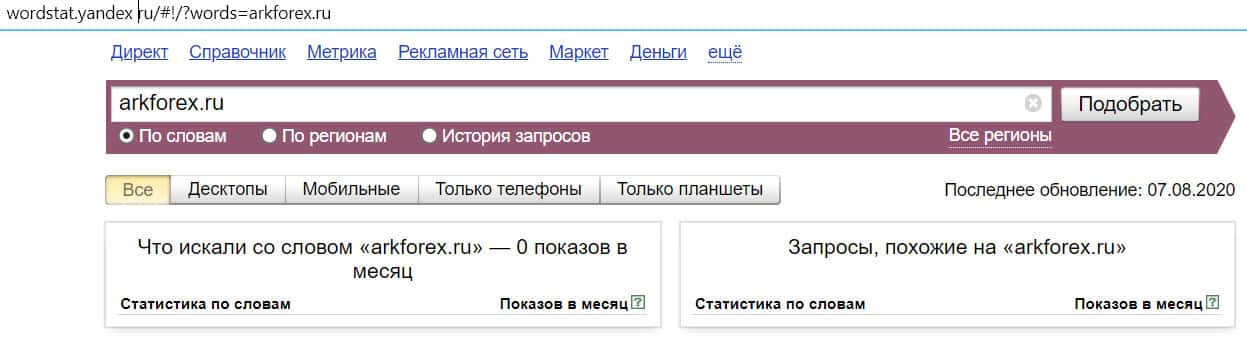 Название бренда на русском языке без пробела "АркФорекс", пользователи также совсем не искали в системе Яндекс.