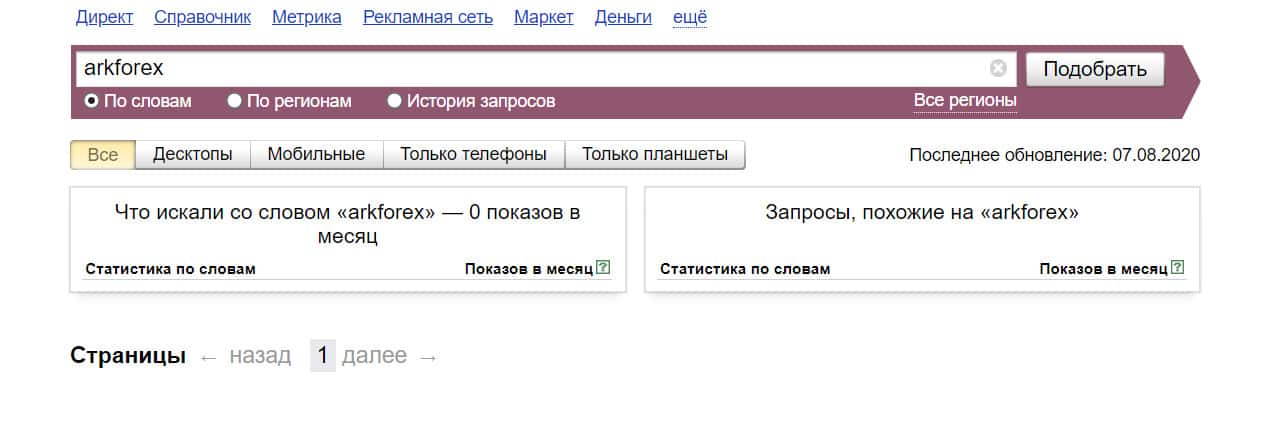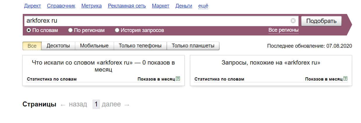 Количество запросов в поисковике Яндекс по доменному имени "arkforex ru" без точки, не отличается от предыдущего. Никто не пытался найти данную брокерскую компанию.