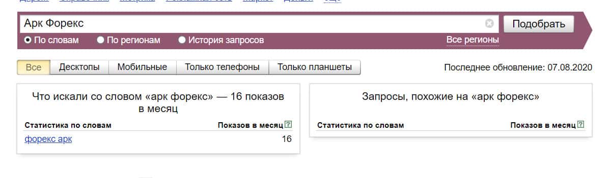 Посмотрим, сколько раз люди искали название бренда "Арк Форекс" на русском языке с пробелом: 16 раз за месяц.