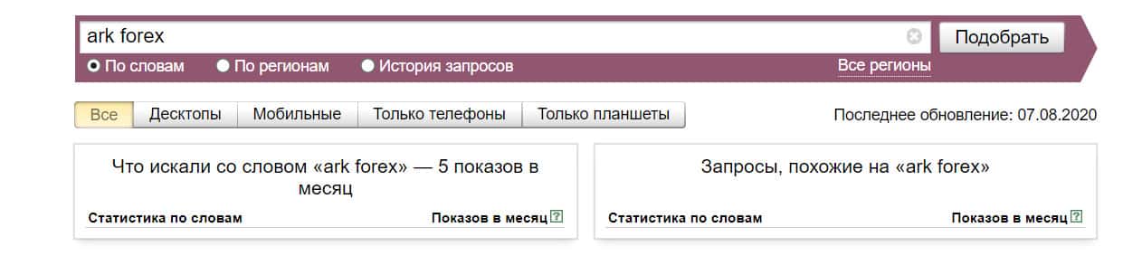 То же название "ark forex", но написанное с пробелом, люди пытались найти в системе Яндекс всего лишь 5 раз.