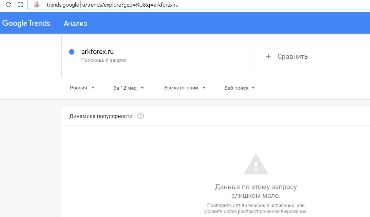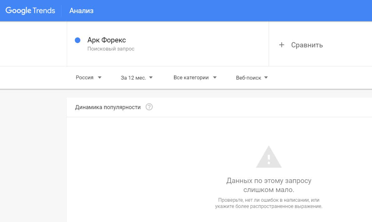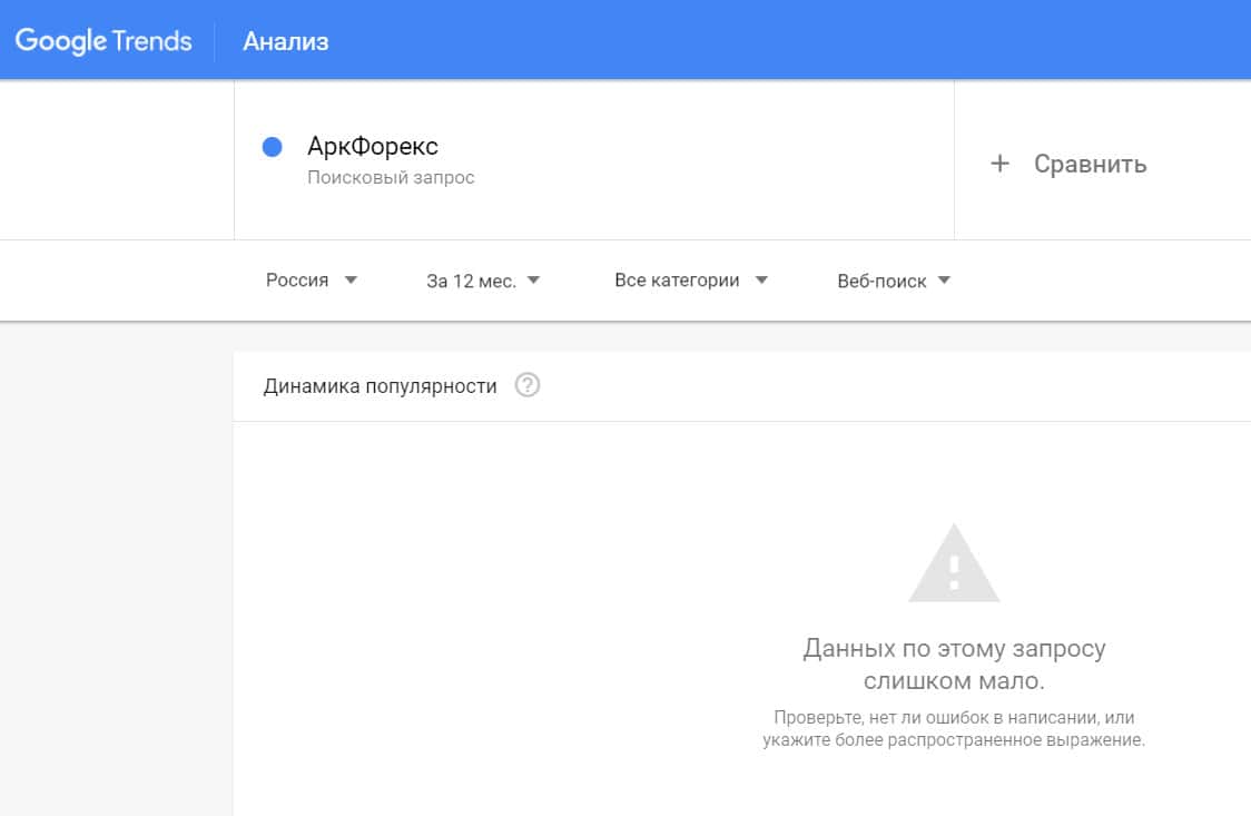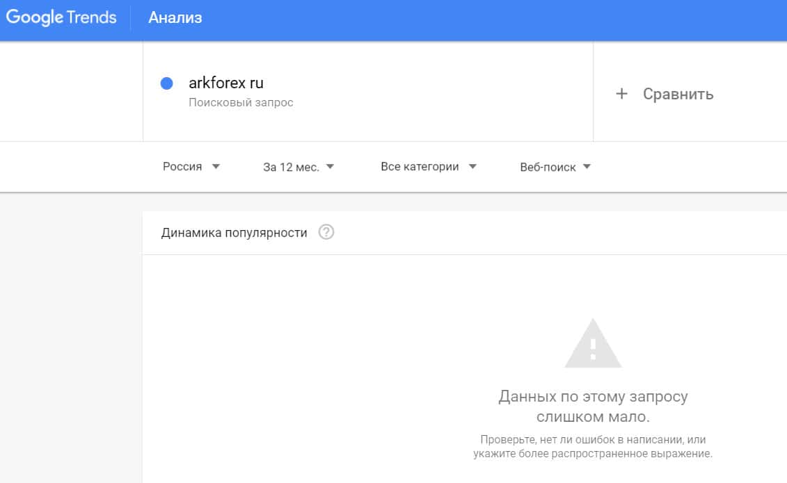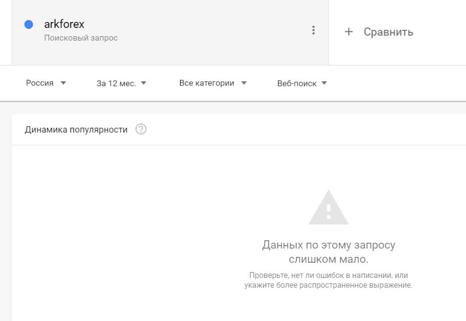 Посмотрим, насколько популярно название бренда "arkforex", написанное на английском языке. Данных по этому запросу нет, так как никто не искал этот бренд в Гугл.