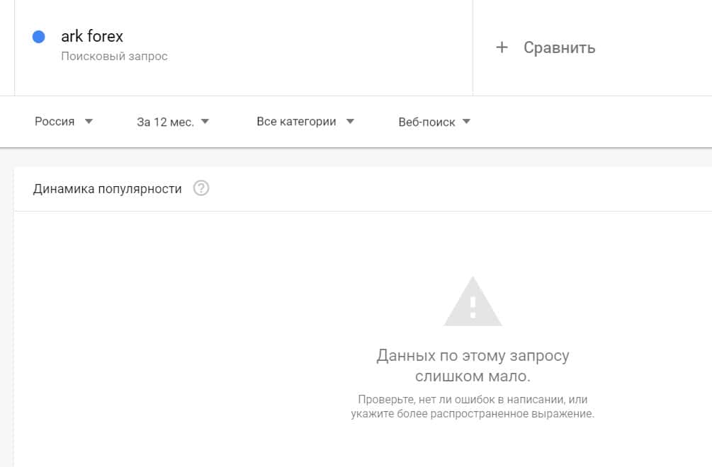 Если вбить то же название на английском языке, но с пробелом - "ark forex", результат поиска будет таким: очень мало данных.