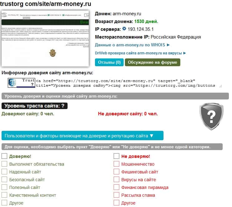 В рунете есть такой известный сайт, как "Доверие в Сети". На нем каждый пользователь может сам поставить свою оценку работе любой компании. Но вот на нем ни одной оценки работы жульнической конторы Arm-Money, потому что мошенники заранее закидали сервис жалобами. Это должно только насторожить.
