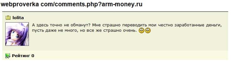 - На известном оценочном портале нет ни одной оценки работы лохотрона Arm-Money