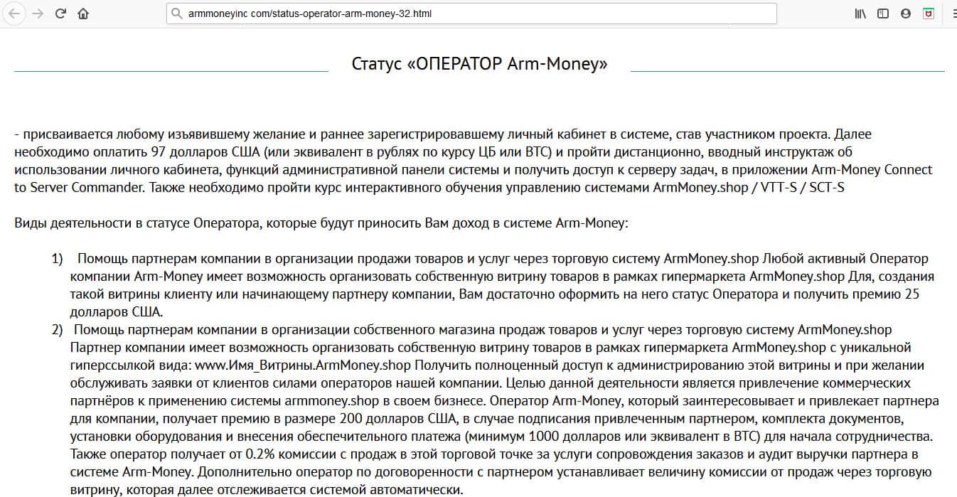 Один из способов "заработка" в Arm-Money (как они утверждают) - это пакет "оператор". И там все через продажу товаров и услуг внутри системы. То есть сразу становится понятно, что на самом деле все деньги будут крутиться внутри этой шараги и в итоге это будут просто нарисованные прибыли, которые вы потом, естественно, не сможете вывести.