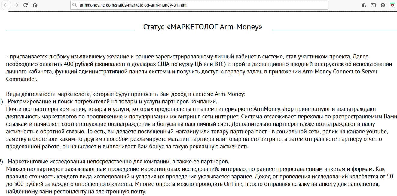 Второй разводняковый пакет от Арм Мани - это пакет "маркетинг". В нем вы должны еще кроме всего прочего делать маркетинговые исследования для этих жуликов, за которые типо будете получать деньги. Это для того, чтобы они в будущем знали кого разводит и как. И вы им в этом будете помогать. Не становитесь соучастниками.