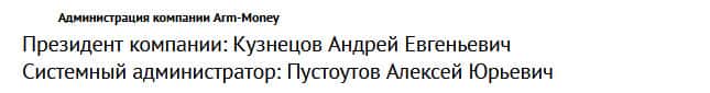 У себя на сайте жулики Arm-Money говорят о том, что их руководитель - Кузнецов Андрей Евгеньевич. Но никакого реального подтверждения этим словам на сайте нет, потому что этого человека просто не существует. Это вымышленный персонаж, которого аферисты сами нарисовали в своей голове и в реальной жизни его просто нет.