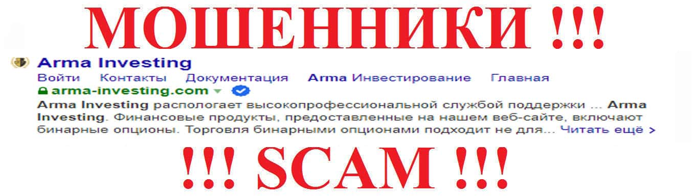 Arma Investing - проект мошенников и аферистов, который предлагает неопытным пользователям интернета инвестировать в торговлю бинарными опционами. При этом их ждут разорение и разочарование, так как они связались с мошенниками, не имеющими ни чести, ни совести