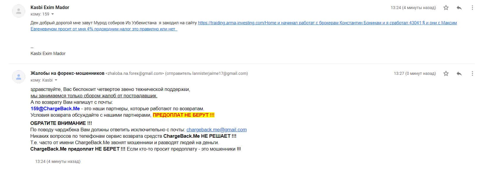 Жалоба представлена от гражданина Узбекистана, который интересуется одним вопросом, касательно условий торговли с жульем Арма Инвестинг. Он вложил туда свыше 4 000 долларов и теперь аферисты требуют заплатить наперед 4%, якобы как подоходный налог. Всем этим занимается некий Максим Евгеньевич.