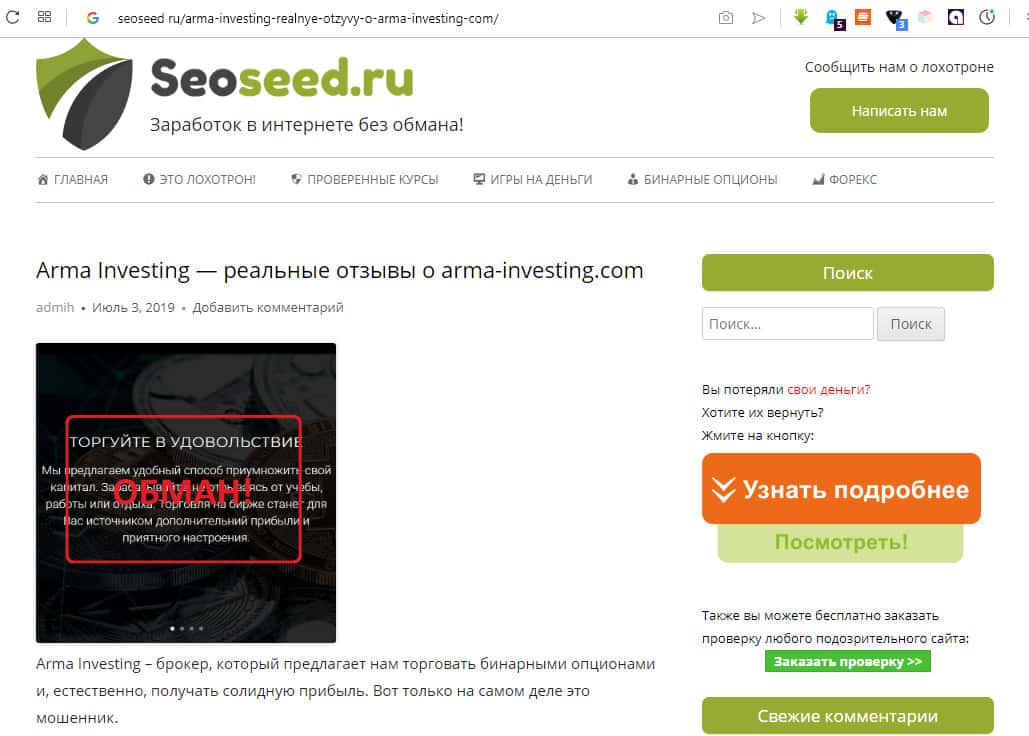 Портал seoseed ru честно и открыто громит жульнический проект Арма ИнвестингГлупая попытка пропиарить аферистов Arma Investing