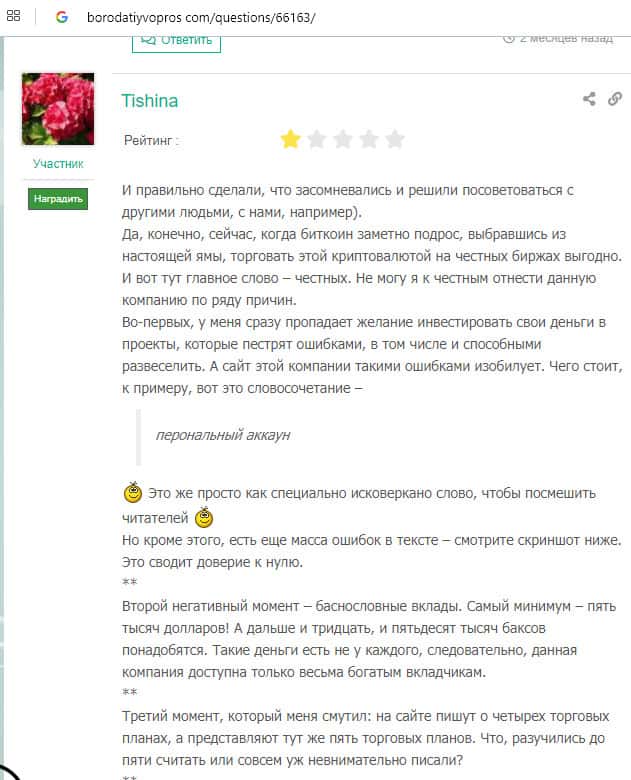 В обзоре компании указывается несколько причин, заставляющих задуматься о принадлежности сайта к мошенникам. Во-первых, сайт изобилует ну уж очень комичными грамматическими ошибками, во-вторых, идет несостыковка в заявленных и фактических торговых планах, их завышенном минимальном пороге, ну и отсутствие лицензии наконец.
