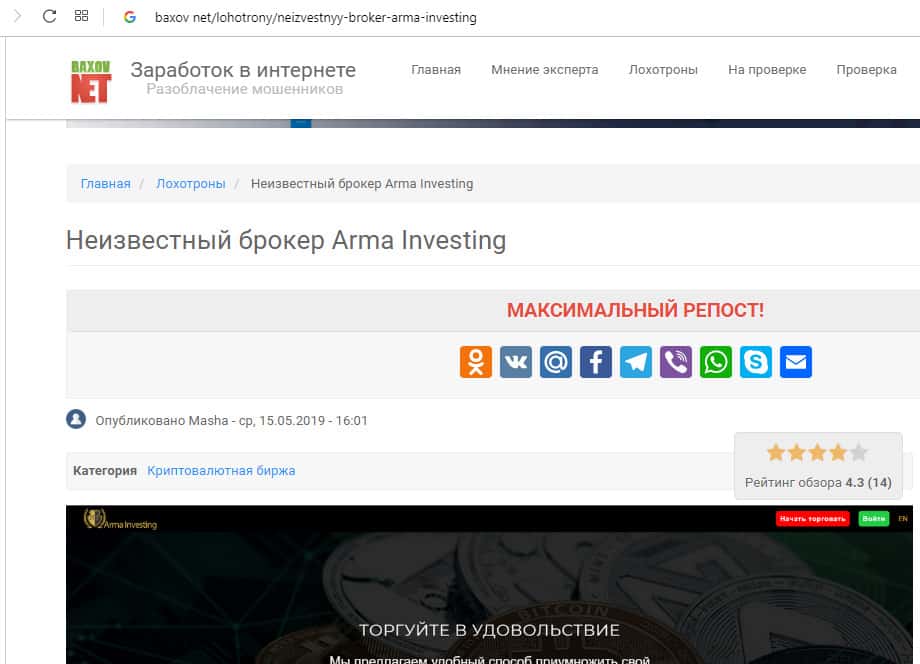 Пользователь masha разместила свой достоверный обзор чудо-брокера Arma Investing на портале baxov net. В нём она разбирает по полочкам все недочеты, ошибки и несуразности портала Арма инвестинг, детально объясняет, на чем основаны её выводы, доказывает, почему нельзя доверить ни копейки аферистам из Арма Инвестинг.