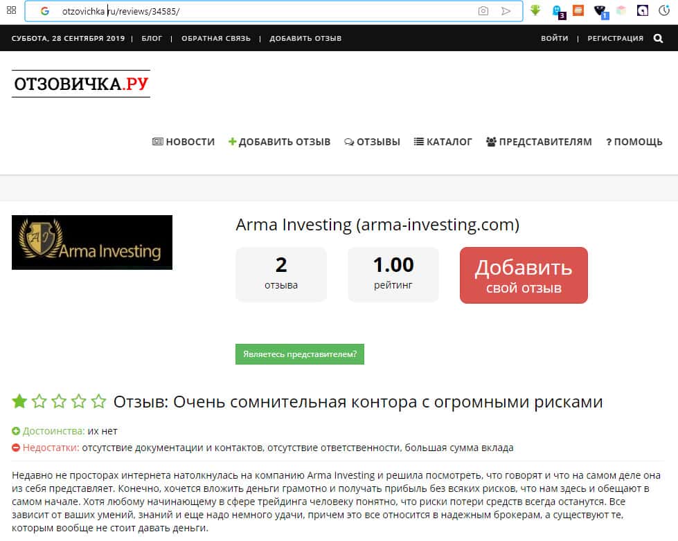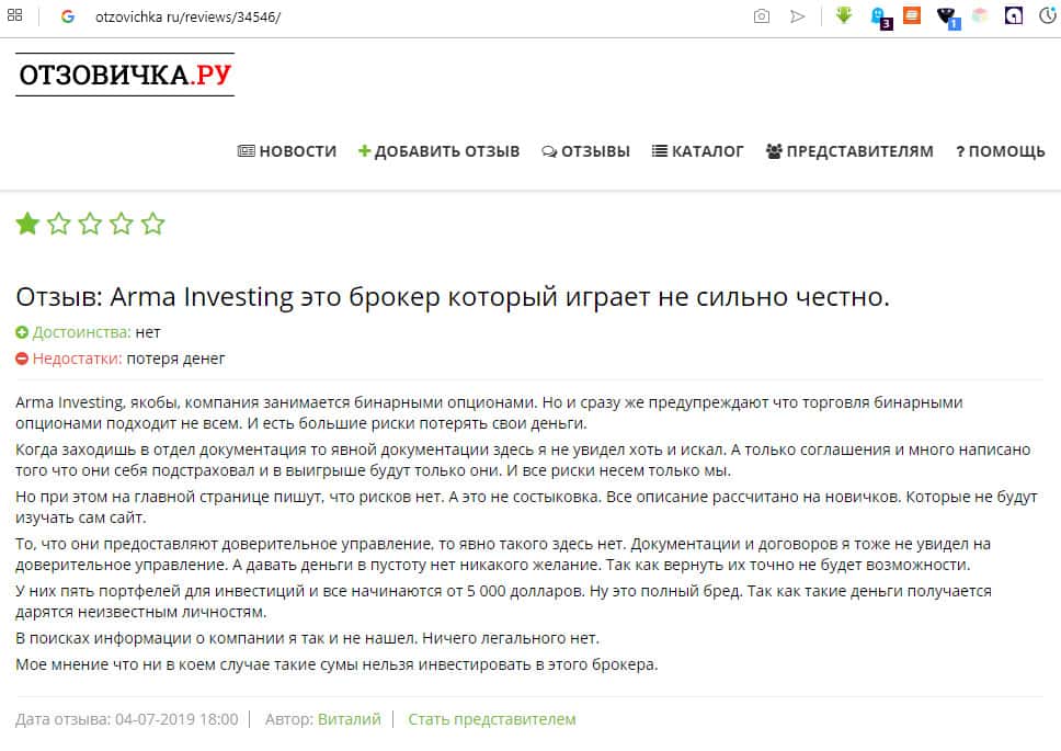Своё негативное мнение о Арма Инвестинг на портале отзовичка ру оставила пользователь FialkaKatrin. В нём она указывает на приметы жульнических сайтов, присущие проекту Арма Инвестинг. Они просят побольше денег; предлагают договор, в котором ни за что не отвечают, но могут менять по своему усмотрению; для связи предлагают уже "спалившиеся" в Интернет телефоны.