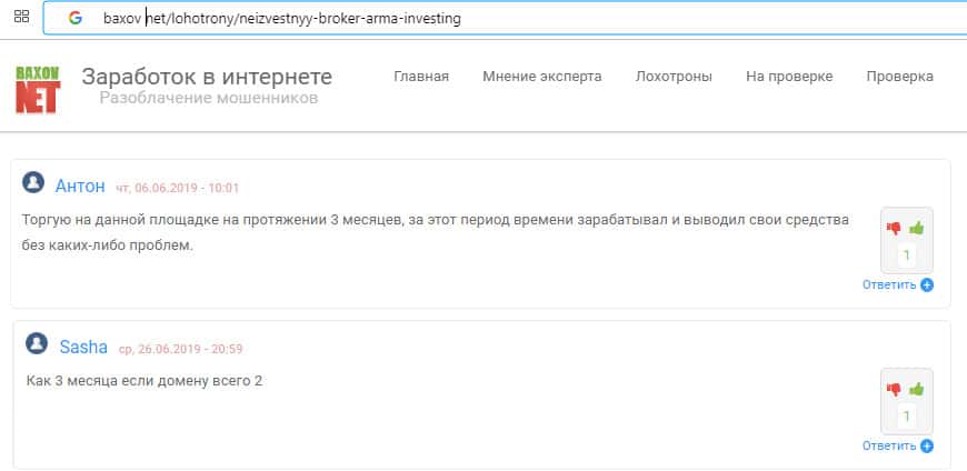Некто Антон на портале баксов нет предпринял попытку вступится за торговую площадку Арма инвестинг, рассказывая о своём трёхмесячном сотрудничестве с данным брокером. В течение этого периода он успел и заработать и беспрепятственно вывести денежные средства. Его спрашивает Sasha, о каких трёх месяцах речь, площадке только два месяца.