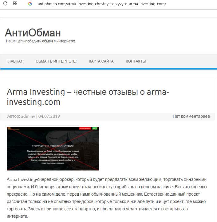 Реальный обзор жульнической торговой площадки Арма инвестинг на портале baxov netРазоблачение мошенников Arma Investing на портале antiobman com