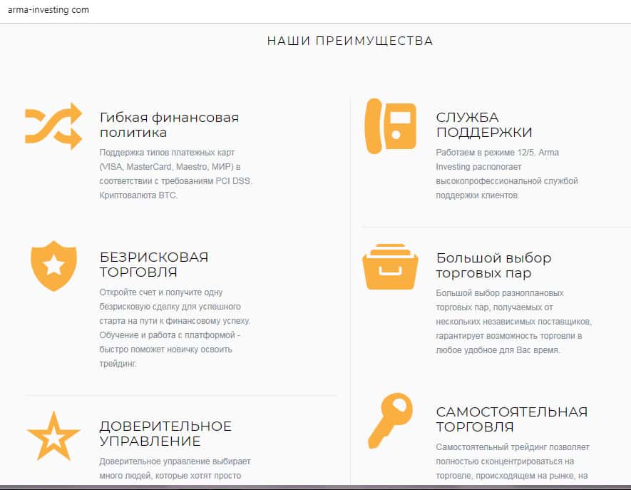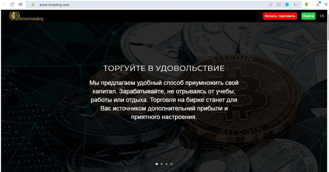 Первый взгляд на главную страницу портала мошенников Arma InvestingМнимые преимущества торговли бинарными опционами и сотрудничества с Арма Инвестинг