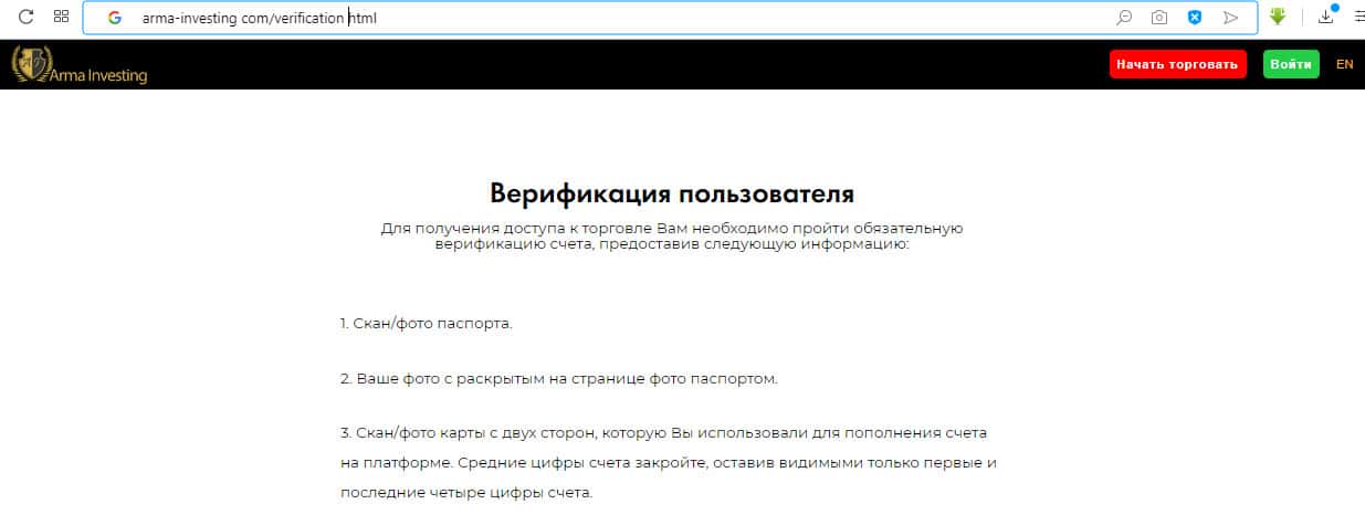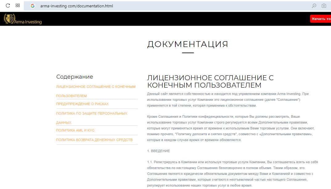 Верификация пользователя на портале Арма Инвестинг - путь в долговую ямуЮридические документы Arma Investing без юридической информации