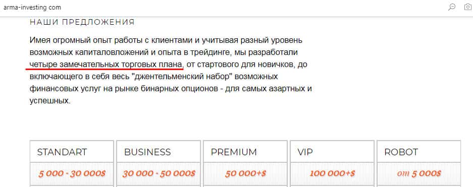 По видимому по мнению жуликов из Арма инвестинг пришло время первой попытки для превращения доверчивого пользователя в клиента: нас знакомят с тарифными планами, предлагаемыми мошенниками в Арма Инвестинг своим клиентам. Говорят почему-то о четырёх торговых планах, а представляют пять.