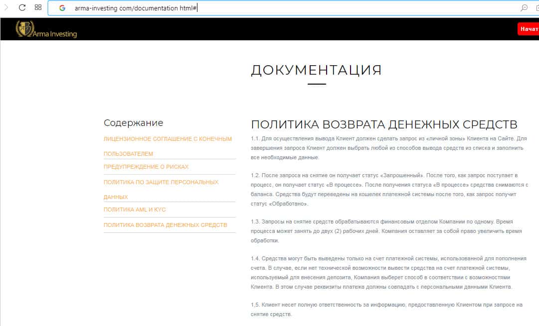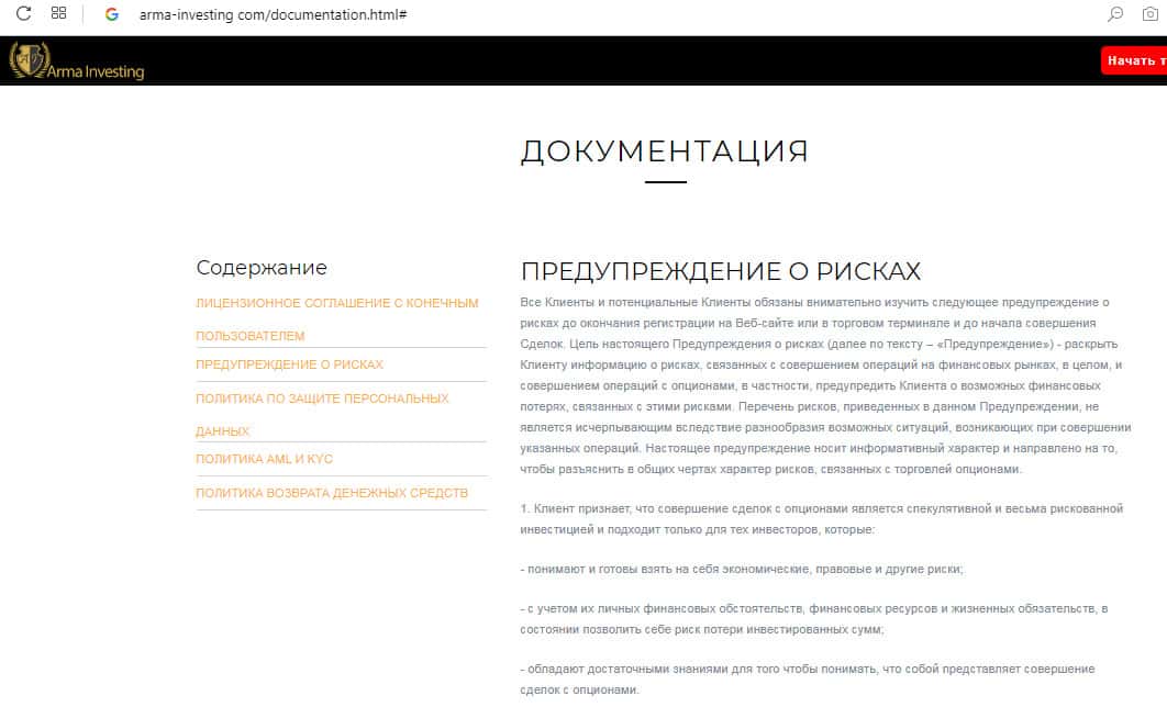 Предупреждение клиента о рисках, связанных с торговлей на площадке Арма Инвестинг В остальных документах та же история. Во всех документах говорится об обязанностях клиента перед компанией и о правах самой компании. Каждый документ заканчивается фразой, что может быть полностью изменен по усмотрению компании без согласования с клиентом, но обязан будет к исполнению последним.