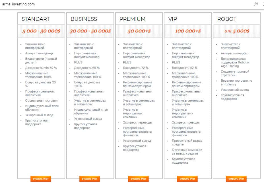 Пять торговых планов по схеме бонусов от Арма Инвестинг 4 1 При знакомстве с тарифными планами, первое, что бросается в глаза, это высокий минимальный порог для депозита в пять тысяч долларов. Почему-то эти аферисты решили, что их лохотрон настолько качественный, что они могут позволить себе требовать настолько много денег. Если хотя бы один перевод сделает клиент, мошенники уже будут "в шоколаде".