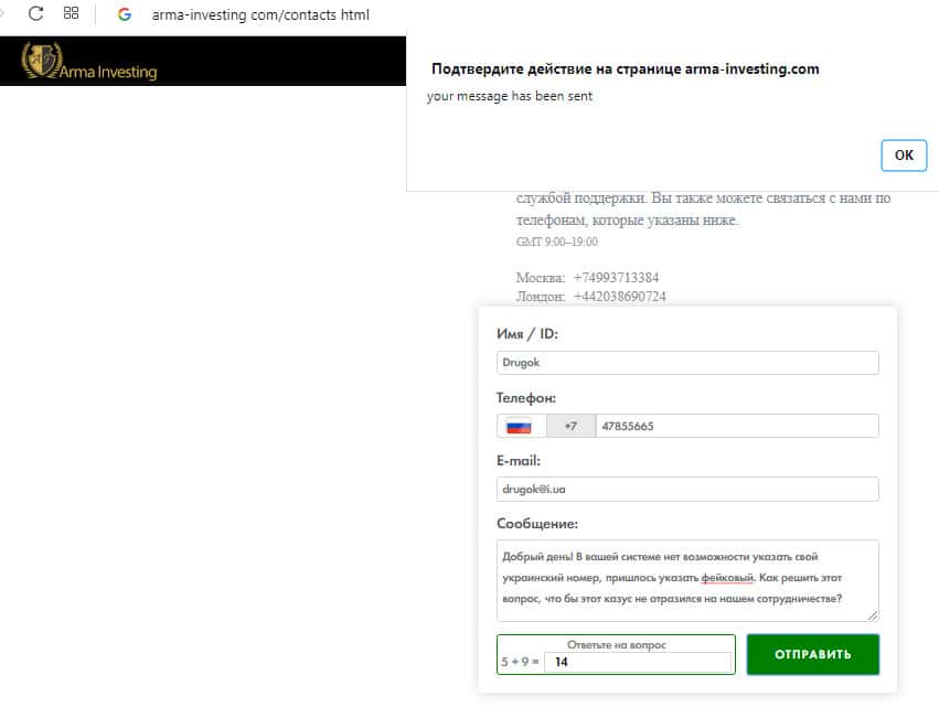 Итак, нам говорят, что Arma Investing располагает высокопрофессиональной службой поддержки. И где же она? Показывают два номера телефона – один фейковый, второй светится в сети как мошеннический. Есть еще форма обратной связи и все. Ни адресов, ни электронных ящиков, ничего. Связи с админами не будет. Попытка оставить сообщение осталась без ответа.