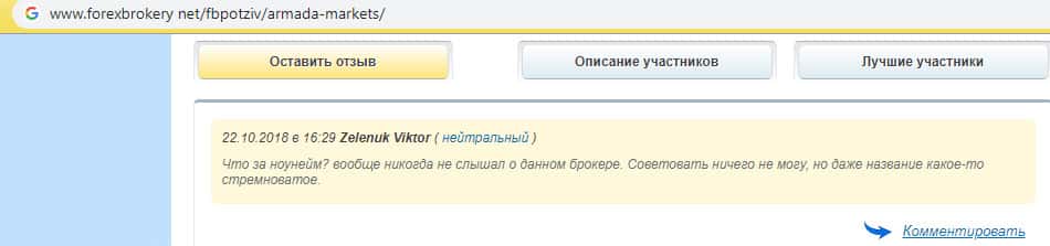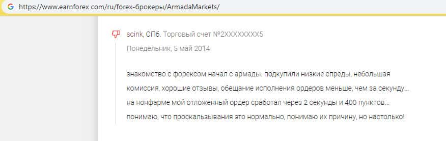 И снова недовольный комментатор утверждает, что торговал у мошенников Армада Маркетс и заметил массу отрицательных сторон, таких как медленное исполнение ордеров или проскальзывания новостей. Когда на своей шкуре начинаешь чувствовать как работает шарага Armada Markets, то сразу понятно, что ее создали для выманивания средств из наивной клиентуры.