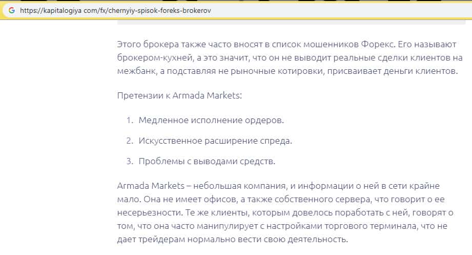 На странице капиталогия ком написана статья, где явно подчеркивается, что шарага Армада Маркетс не имеет офисов и сервера, что говорит о ее несерьезности. Те же клиенты, которым довелось поработать с ней, говорят, что она часто манипулирует с настройками торгового терминала и не дает трейдерам нормально вести свою деятельность.