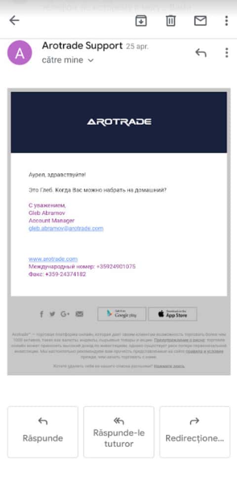 Данные контактов жуликов, которые проводили лохотрон: почты support@arotrade com и valentina.zueva@arotrade com, телефон 35924950556.