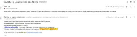Еще 250 долларов шаралатаны конторы Аро Трейд решили не отдавать своему клиенту, так как посчитали, что это небольшие деньги и жертва сильно об этом беспокоиться не будет. Но человек пошел на принцип и написал жалобу в организацию по возврату средств из форекс-лохотронов под названием ChargBack.Me которая понимает как вести себя в подобном случае.