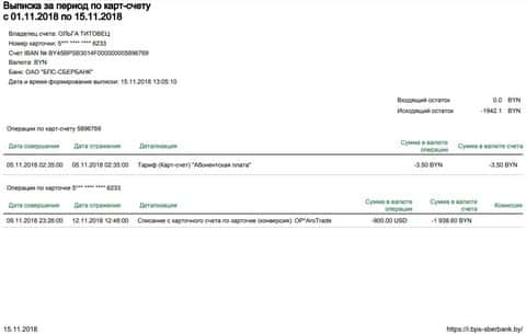 Далее представлена копия документа, согласно которому подтверждается факт перевода денежных средств в размере 900 долларов на счета аферистов Аро Трейд