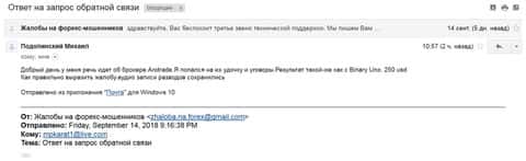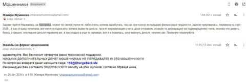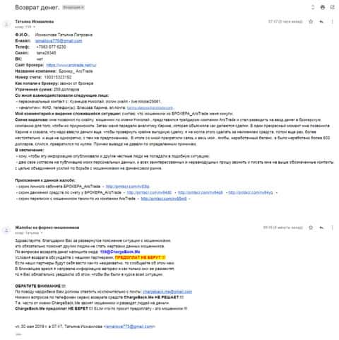 Далее представлен скриншот письма от человека, который попал в дилинговую кухню AroTrade. Также представлены некоторые данные мошенников:
