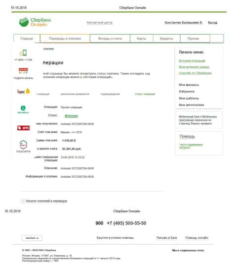 Далее представлен скрин личного кабинета клиента в Сбербанк-онлайн, где можно увидеть подтверждение суммы перевода на счета аферистов.