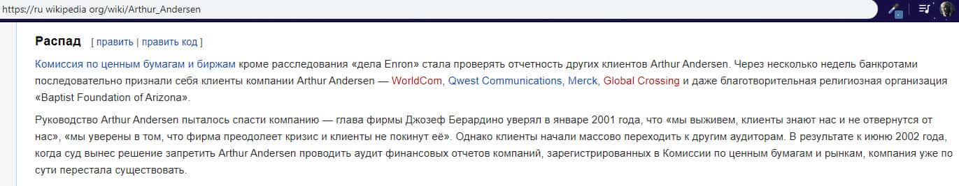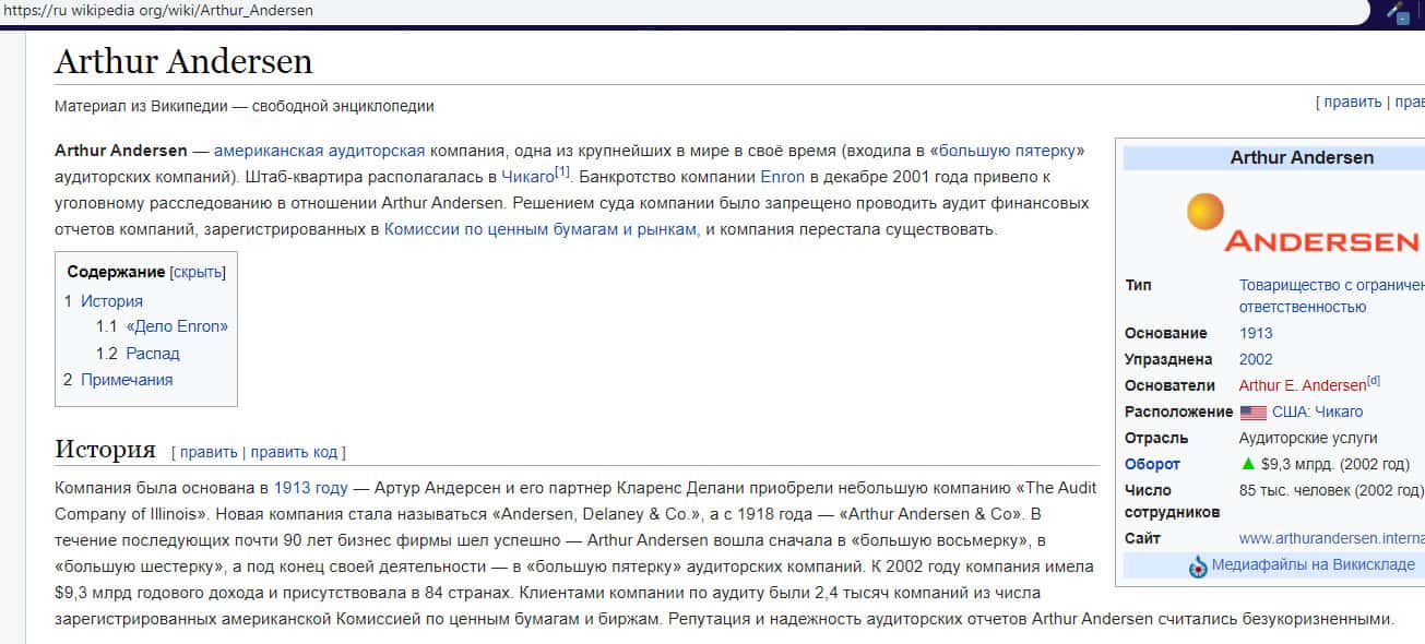 Подробнее узнать о деятельности мошенников Артур Андерсен можно узнать непосредственно с помощью веб-площадки wikipedia org, где сразу дается информация о том, что шулера Arthur Andersen были американской аудиторской компанией, которая была известна на весь мир, о чем вы можете подробнее прочесть на изображении, расположенном ниже.